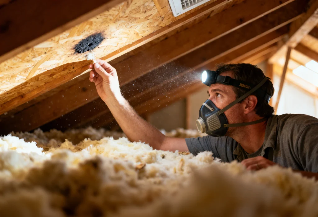Brown rings, yellow spots, or streaks on ceilings and walls are common leak signals. The stain may appear far from the real entry point because water travels along framing.